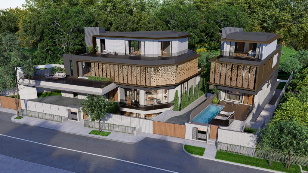 2 units of a 2-storey envelope control bungalow dwelling, each with a basement, attic and swimming pool